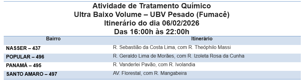 As equipes da Gerência de Controle de Endemias Vetoriais (GCEV) da Secretaria Municipal de Saúde (Sesau) circularão das 16h às 22h pelas ruas dos seguintes bairros: Nasser, Popular, Panamá e Santo Amaro.