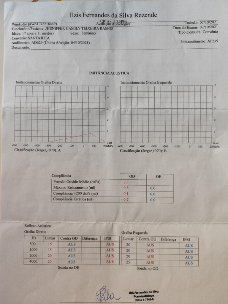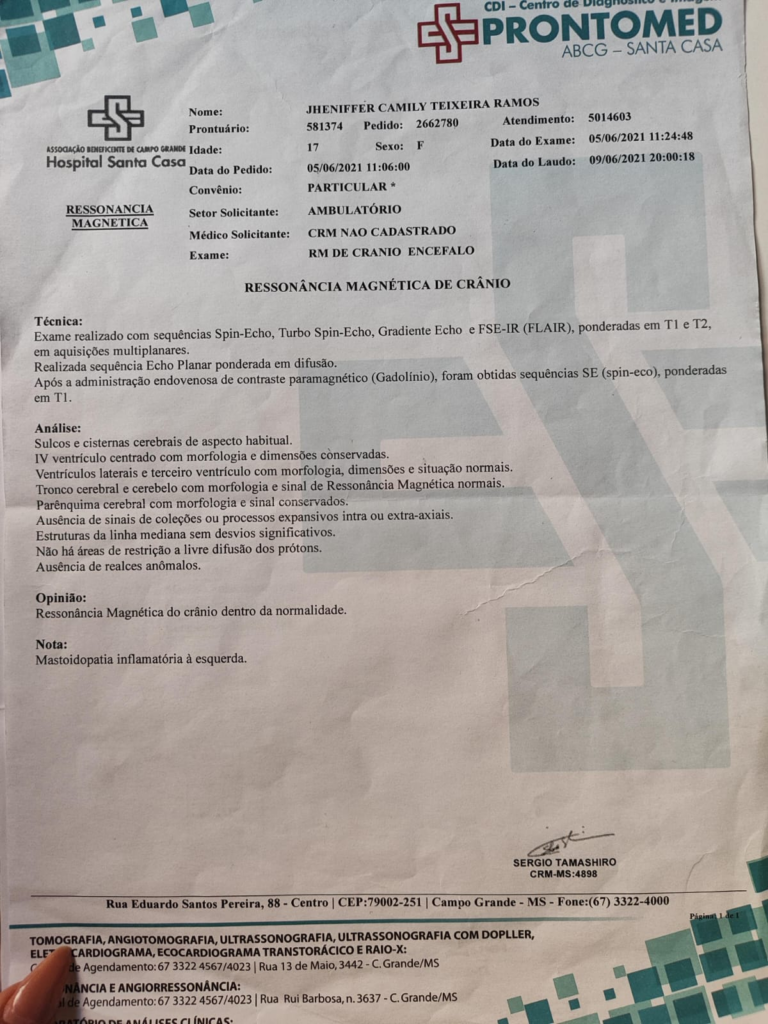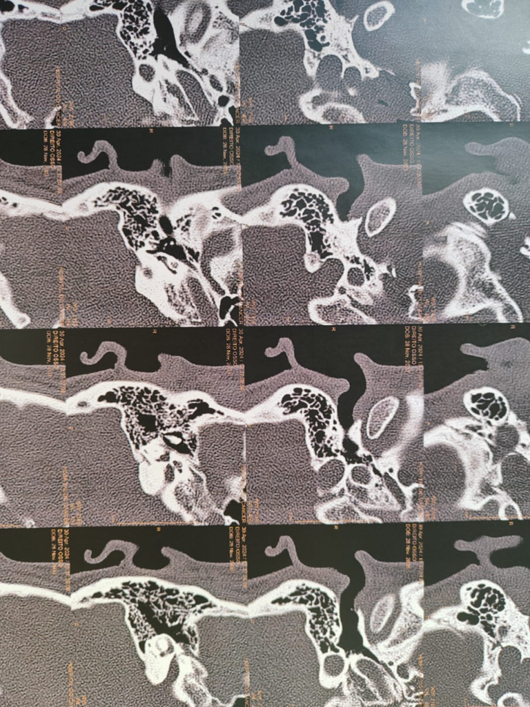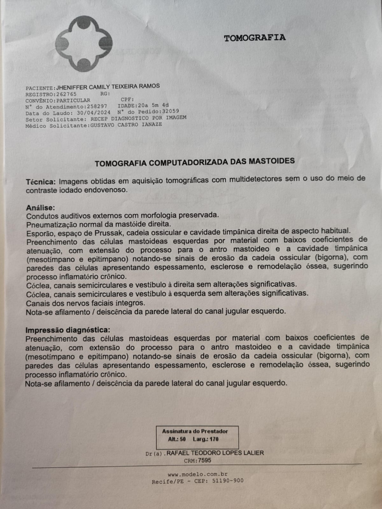 Jheniffer Teixeira de 20 anos desde de criança sempre teve problemas envolvendo seu ouvido, muitas infecções de otite recorrente. Em 2021 realizou uma tomografia do crânio por contas de dores recorrentes na cabeça, resultando no diagnóstico de mastoidopatia inflamatória à esquerda. Realizou tratamento pois somente era uma otite. Após 3 anos começou a sentir dores fortes no ouvido, zumbido e secreção amarelada. Mas uma vez precisou recorrer aos médicos. Uma consulta com o otorrino que me passou uma exame de tomografia da mastoide, os sintomas indicavam um Colesteatoma.