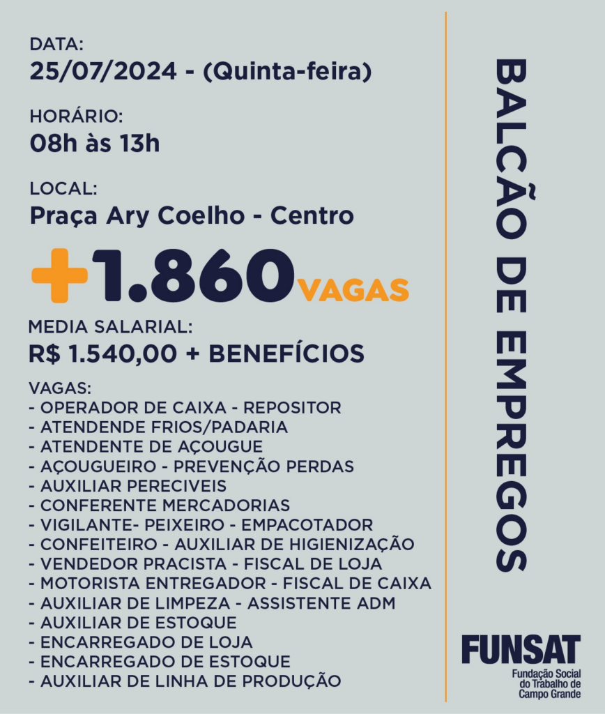 Nesta quinta-feira (25), para quem passar pelo Centro de Campo Grande, a Praça Ary Coelho será um ponto para conectar empresas e trabalhadores, no intuito de preencher 1.860 vagas, em uma ação itinerante da Funsat (Fundação Social do Trabalho). São ao todo 14 empresas buscando colaboradores para emprego formal em 15 atividades diferentes.
