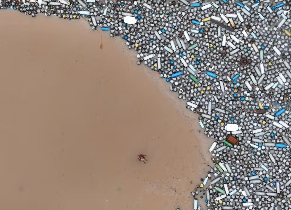Barreira é erguida para conter botijões de gás à deriva que correm o risco de se dispersarem de uma distribuidora por conta da enchente que atingiu Canoas/Rio Grande do Sul. Para evitar acidentes, barreiras de contenção foram instaladas por uma empresa especializada, com o objetivo de impedir que a água os leve para outras áreas.