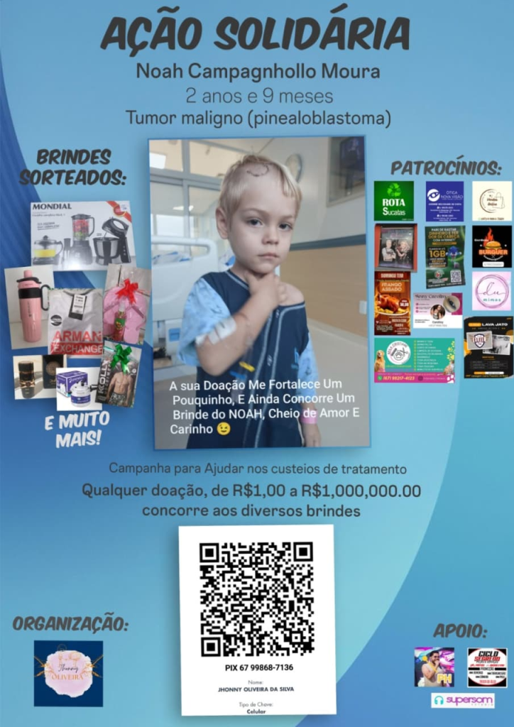 Uma corrente de solidariedade está sendo organizada para apoiar o pequeno Noah Campagnollo Moura, de apenas 2 anos e 9 meses, diagnosticado com um tumor maligno raro, o pinealoblastoma. A campanha tem como objetivo arrecadar recursos para auxiliar nos custos do tratamento, que exige acompanhamento médico especializado e despesas contínuas.