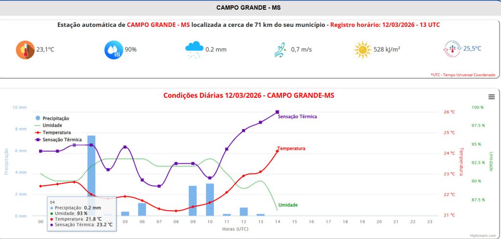 Dados da estação automática do INMET indicam que a madrugada desta quarta-feira (12) em Campo Grande foi marcada por pancadas isoladas de chuva e elevada umidade relativa do ar. O maior volume ocorreu por volta das 3h (UTC), quando o acumulado se aproximou de 7 mm, seguido por precipitações fracas nas horas seguintes. A temperatura iniciou o período em torno de 22 °C e apresentou queda leve nas primeiras horas da manhã.