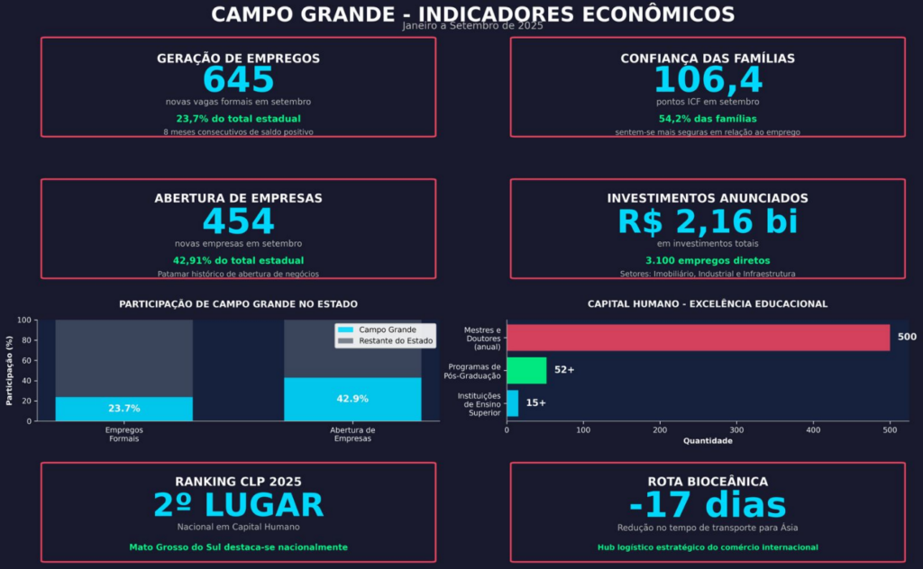 Campo Grande encerrou o mês de setembro de 2025 reafirmando sua posição como o principal polo econômico de Mato Grosso do Sul, com desempenho expressivo na geração de empregos formais, abertura de novos negócios e atração de investimentos estruturantes. O cenário positivo vem acompanhado dos melhores índices de confiança das famílias em relação ao crescimento econômico do município.