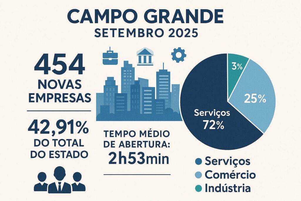 Campo Grande respondeu por 454 novos empreendimentos (42,91% do total estadual), mantendo participação superior a 40% pelo segundo mês seguido. A predominância é do setor de Serviços (72,2%), seguido por Comércio (25,1%) e Indústria (2,6%).