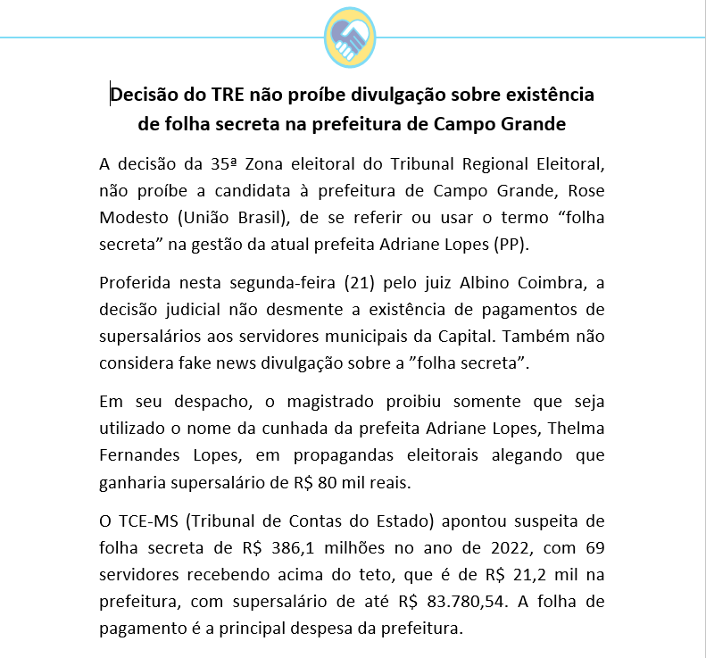 A decisão da 35ª Zona eleitoral do Tribunal Regional Eleitoral, não proíbe a candidata à prefeitura de Campo Grande, Rose Modesto (União Brasil), de se referir ou usar o termo “folha secreta” na gestão da atual prefeita Adriane Lopes (PP).