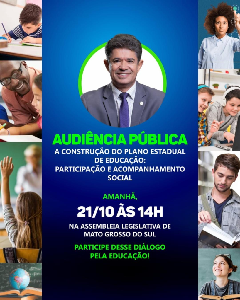 A audiência pública “A Construção do Plano Estadual de Educação: Participação e Acompanhamento Social” será realizada na terça-feira (21), às 14h, no Plenário Deputado Júlio Maia, com transmissão ao vivo pela TV ALEMS e pelas redes sociais da Assembleia Legislativa.