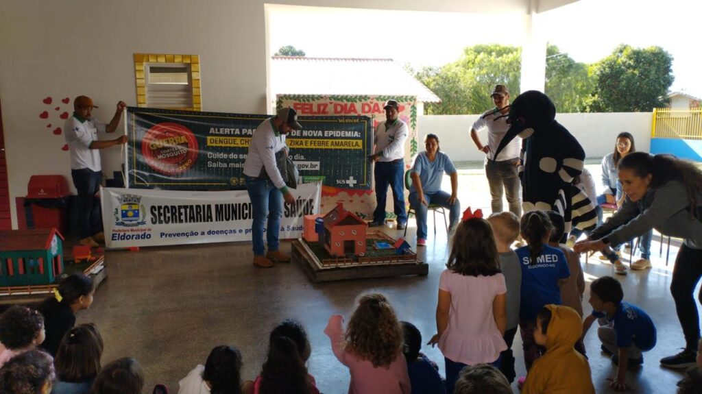 Considerando a incidência e a gravidade das doenças transmitidas pelo Aedes Aegypti (dengue, zika e chikungunya), a Secretaria Municipal de Saúde vem realizando apresentação em todas as escolas: CEI Pingo de Gente, CEI David Fuzario, CEI Itamar Evaristo (Morumbi), CEI Nossa Senhora Aparecida, Escola Municipal Sebastião de Paula, Escola Estadual Eldorado, Escola Estadual Treze de Maio e Escola Municipal Aldeia Cerrito, mobilização realizada pela equipe da saúde, orientando estratégias e medidas de prevenção. A dificuldade de eliminação do vetor (mosquito e larvas), nos levaram a criar estratégias inovadoras e incluir na educação básica da rede de ensino o relevante assunto através do Programa Saúde na Escola (PSE).