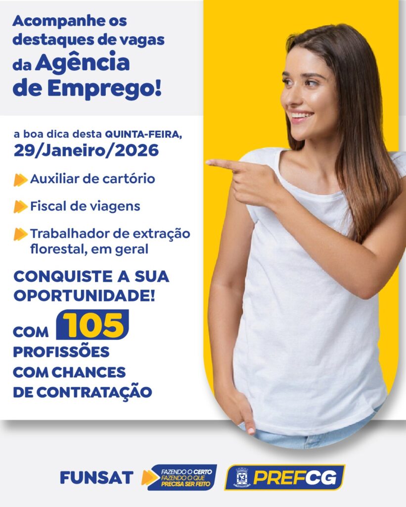 A Funsat (Fundação Social do Trabalho), por meio de sua Agência de Empregos, oferta 1.230 vagas nesta quinta-feira (29). A intermediação contempla 105 profissões, com oportunidades para preenchimento em 128 empresas de Campo Grande. As vagas estão disponíveis exclusivamente para candidatos com o cadastro atualizado no sistema administrado pelo órgão.