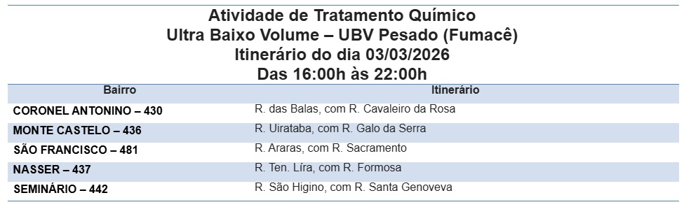 A ação busca conter a proliferação do mosquito Aedes aegypti, transmissor da Dengue, Zika e Chikungunya. Conforme a Coordenadoria de Controle de Endemias Vetoriais (CCEV), o serviço ocorre das 16h às 22h nos bairros Coronel Antonino, Monte Castelo, São Francisco, Nasser e Seminário.