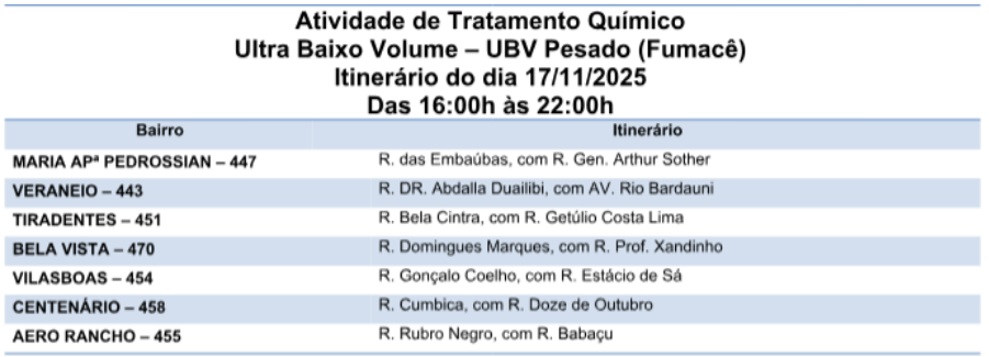 As equipes da Coordenadoria de Controle de Endemias Vetoriais (CCEV) da Secretaria Municipal de Saúde (Sesau) circularão das 16h às 22h pelas ruas dos seguintes bairros: Maria Aparecida Pedrossian, Jardim Veraneio, Tiradentes, Jardim Bela Vista, Vilas Boas, Centenário e Aero Rancho.
