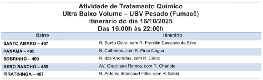 As equipes da Coordenadoria de Controle de Endemias Vetoriais (CCEV) da Secretaria Municipal de Saúde (Sesau) circularão das 16h às 22h, passarão pelos bairros: Santo Amaro, Jardim Panamá, Vila Sobrinho, Aero Rancho e Piratininga.