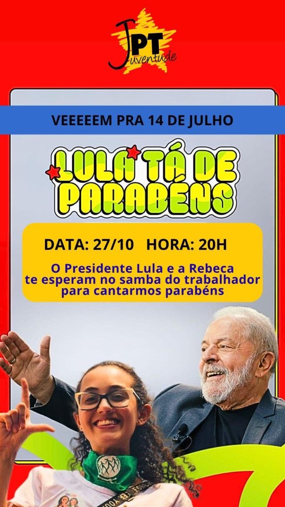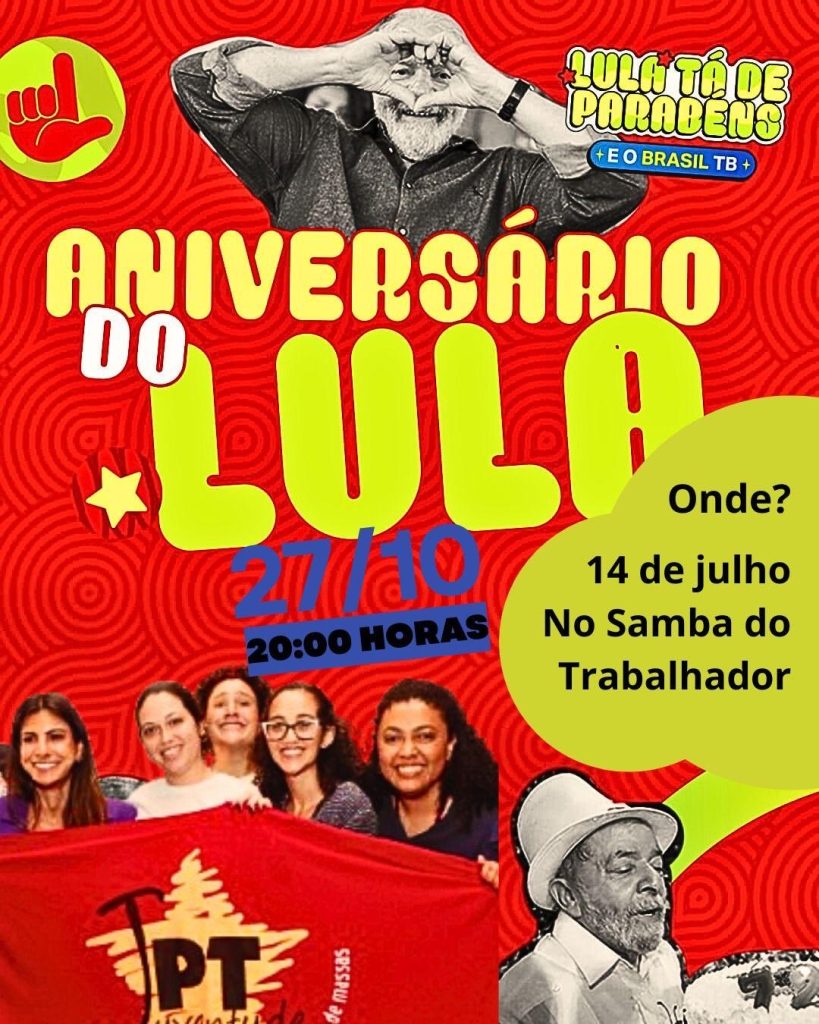A Juventude do Partido dos Trabalhadores (PT) promove nesta segunda-feira (27) uma celebração especial pelo aniversário do presidente Luiz Inácio Lula da Silva, durante o tradicional Samba do Trabalhador, realizado no Copo Bar, na Rua 14 de Julho, a partir das 20h.
