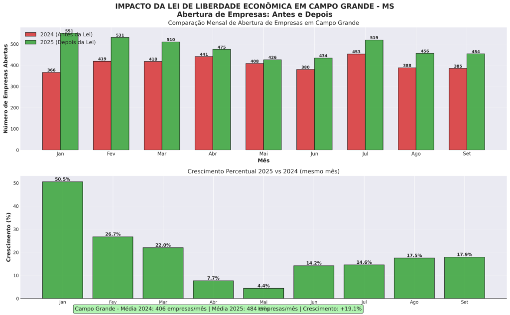 De acordo com dados da Junta Comercial de Mato Grosso do Sul (JUCEMS), o impacto da nova legislação foi imediato. A partir de janeiro de 2025, houve uma aceleração consistente na criação de novas empresas tanto na capital quanto em outras cidades do estado.