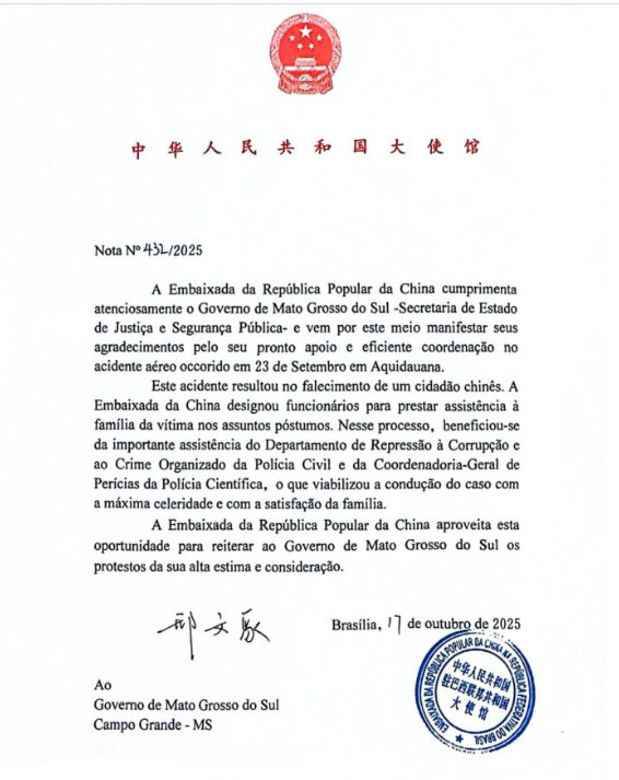 A Embaixada da República Popular da China emitiu uma carta de agradecimento ao Governo de Mato Grosso do Sul pelo trabalho realizado pelas equipes de Segurança Pública do Estado no acidente aéreo ocorrido no dia 23 de setembro em Aquidauana (MS), que matou 4 pessoas, entre elas o arquiteto chinês Kongjian Yu.