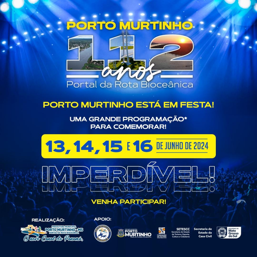 Porto Murtinho, no Mato Grosso do Sul, se prepara para celebrar seu 112º aniversário com uma programação que se estende por quatro dias, repletos de música, rodeio e outras atrações tradicionais nessa época do ano. De 13 a 16 de junho, o evento “Aniversário de 112 anos de Porto Murtinho com Rodeio Show” contará com a participação de grandes nomes da música sertaneja nacional. A celebração do 112º aniversário de Porto Murtinho é uma iniciativa da Prefeitura, liderada pelo prefeito Nelson Cintra.