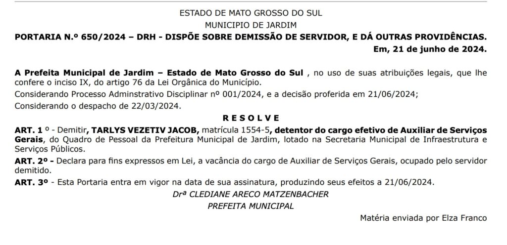 O presidente municipal do partido político Republicanos de Jardim, Tarlys Vezetiv Jacob, foi exonerado do serviço público municipal por justa causa no dia 21 de junho. A publicação no Diário Oficial dos Municípios ocorreu na segunda (24).