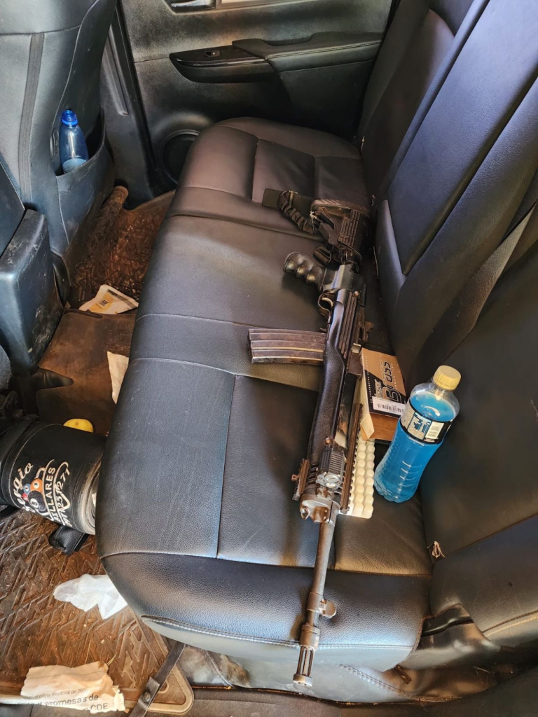 No imóvel, os policiais apreenderam um fuzil Colt M4LE e um Ruger calibre 5,56 mm, além de carregadores, munições prontas para uso, uma caminhonete Toyota Hilux, um Kia Cerato e placas veiculares com identificação brasileira.